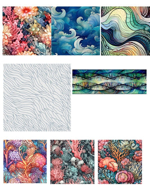 1/2 yard each of 6 coordinating fabrics in coral and wave prints.